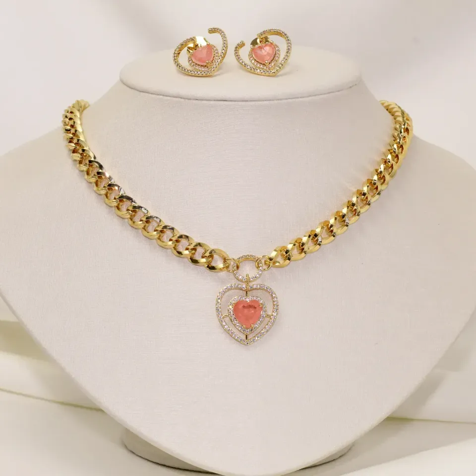 CONJUNTO CORAÇÃO COM PEDRA ZIRCÔNIA COR SALMÃO BANHO OURO 18K