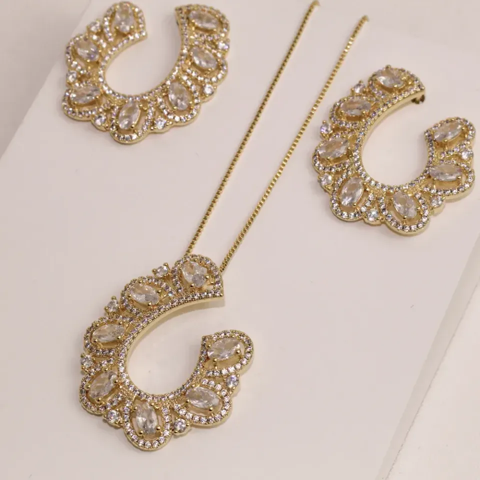 CONJUNTO CRAVEJADO COM ZIRCÔNIAS CRISTAIS BANHO OURO 18K