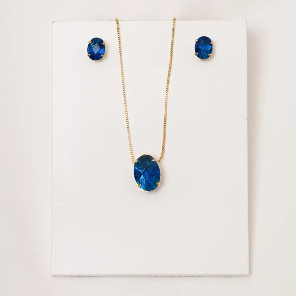 CONJUNTO CRISTAL OVAL AZUL BANHO OURO 18K