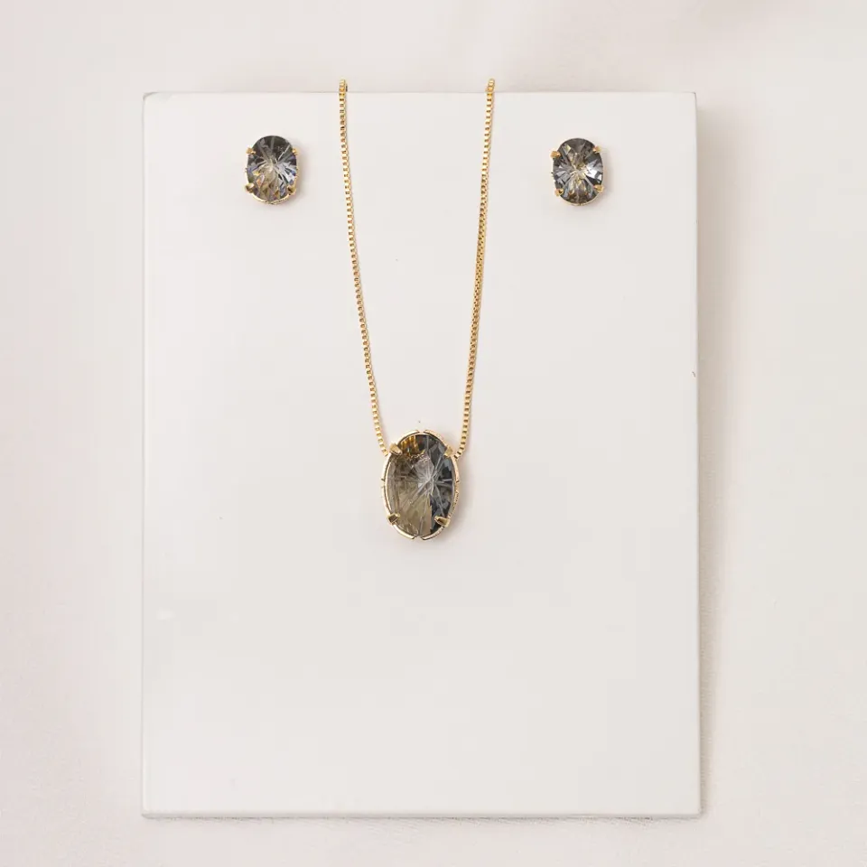 CONJUNTO CRISTAL OVAL FUMÊ BANHO OURO 18K