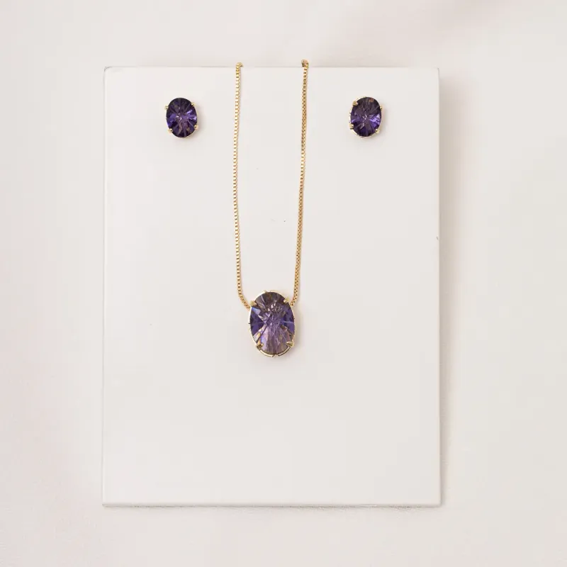 CONJUNTO CRISTAL OVAL ROXO BANHO OURO 18K