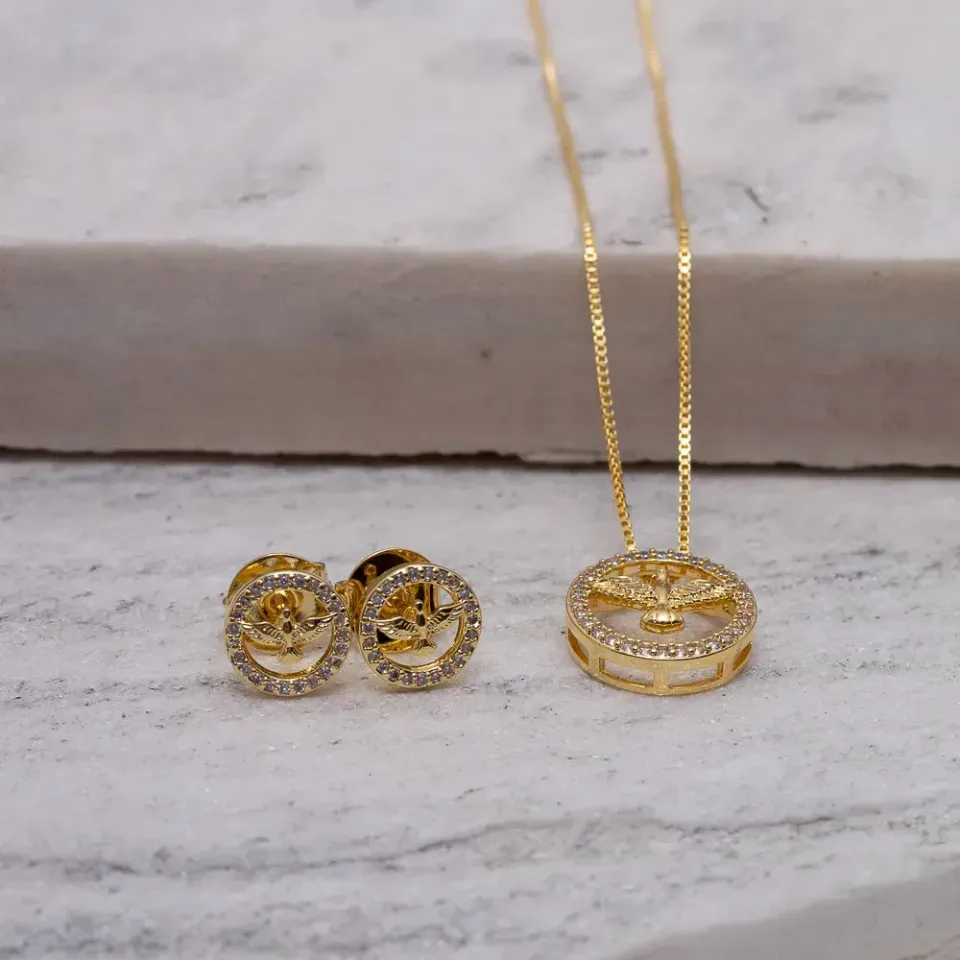 CONJUNTO ESPÍRITO SANTO CRAVEJADO COM ZIRCÔNIAS BANHO OURO 18K