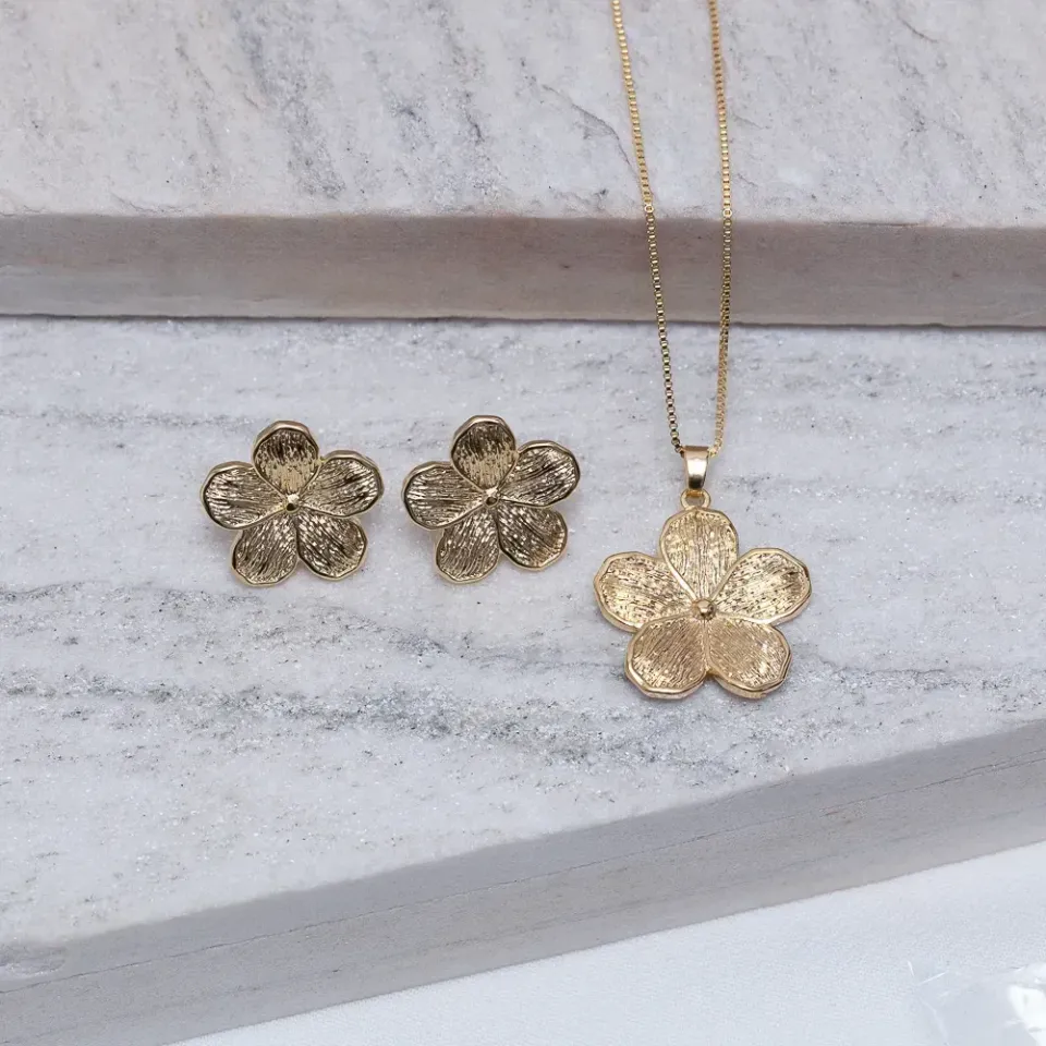 CONJUNTO FLOR RISCADA BANHO OURO 18K