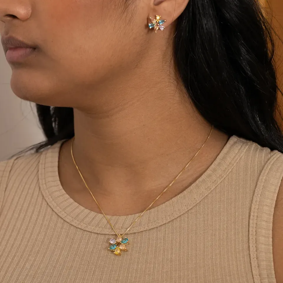 CONJUNTO FLOR COM PEDRAS COLORIDAS BANHO OURO 18K