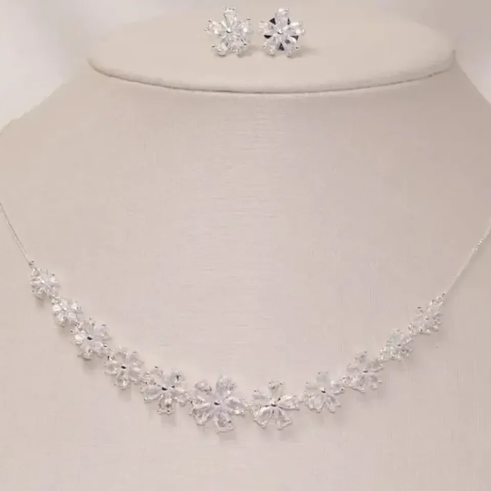 CONJUNTO FLOR COM PEDRAS CRISTAIS BANHO PRATA