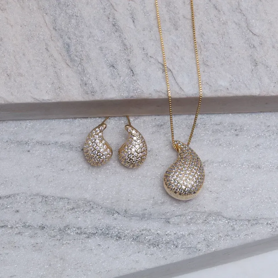 CONJUNTO GOTA ABAULADA CRAVEJADA BANHO OURO 18K