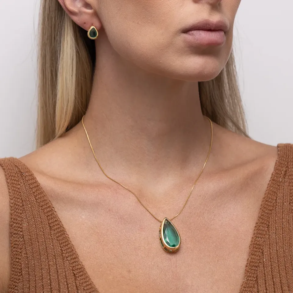 CONJUNTO GOTA GRANDE COM PEDRA VERDE BANHO OURO 18K