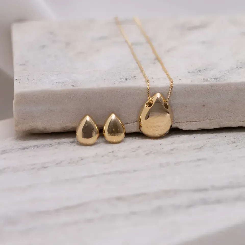 CONJUNTO GOTA LISA PEQUENA BANHO OURO 18K