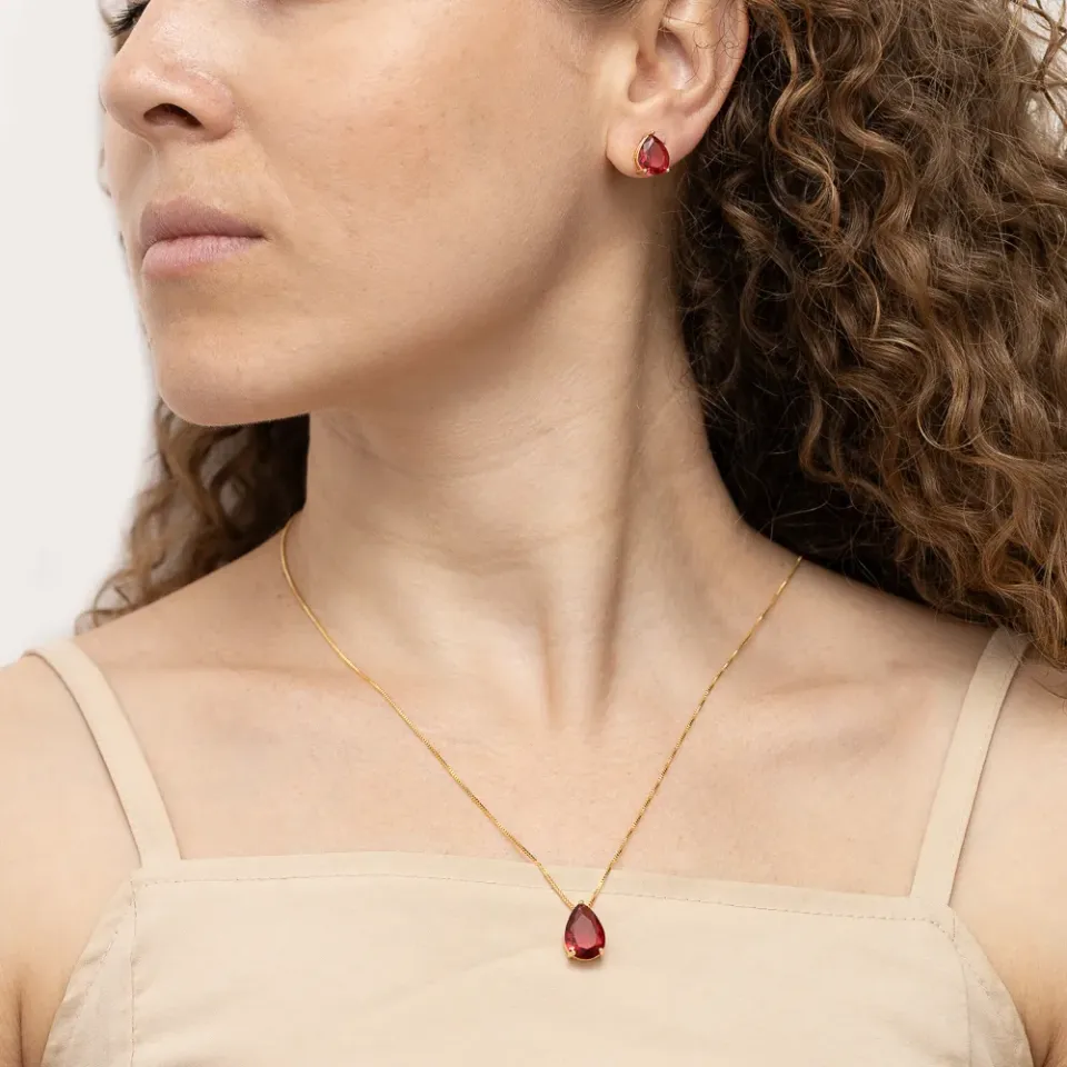 Conjunto Gota com Pedra Vermelho Rubi em banho Ouro 18K
