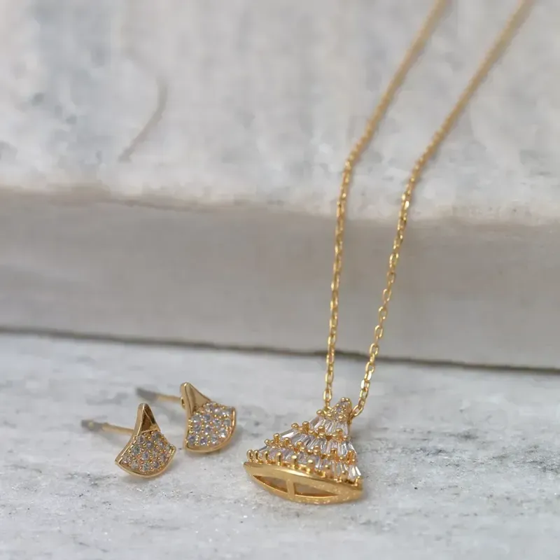 CONJUNTO LEQUE COM ZIRCÔNIAS CRISTAIS BANHO OURO 18K