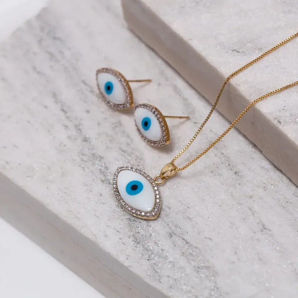 CONJUNTO OLHO GREGO ZIRCÔNIA BANHO OURO 18K