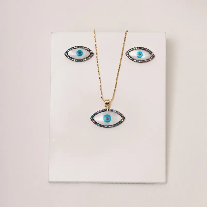 CONJUNTO OLHO GREGO ZIRCÔNIA COLORIDAS BANHO OURO 18K