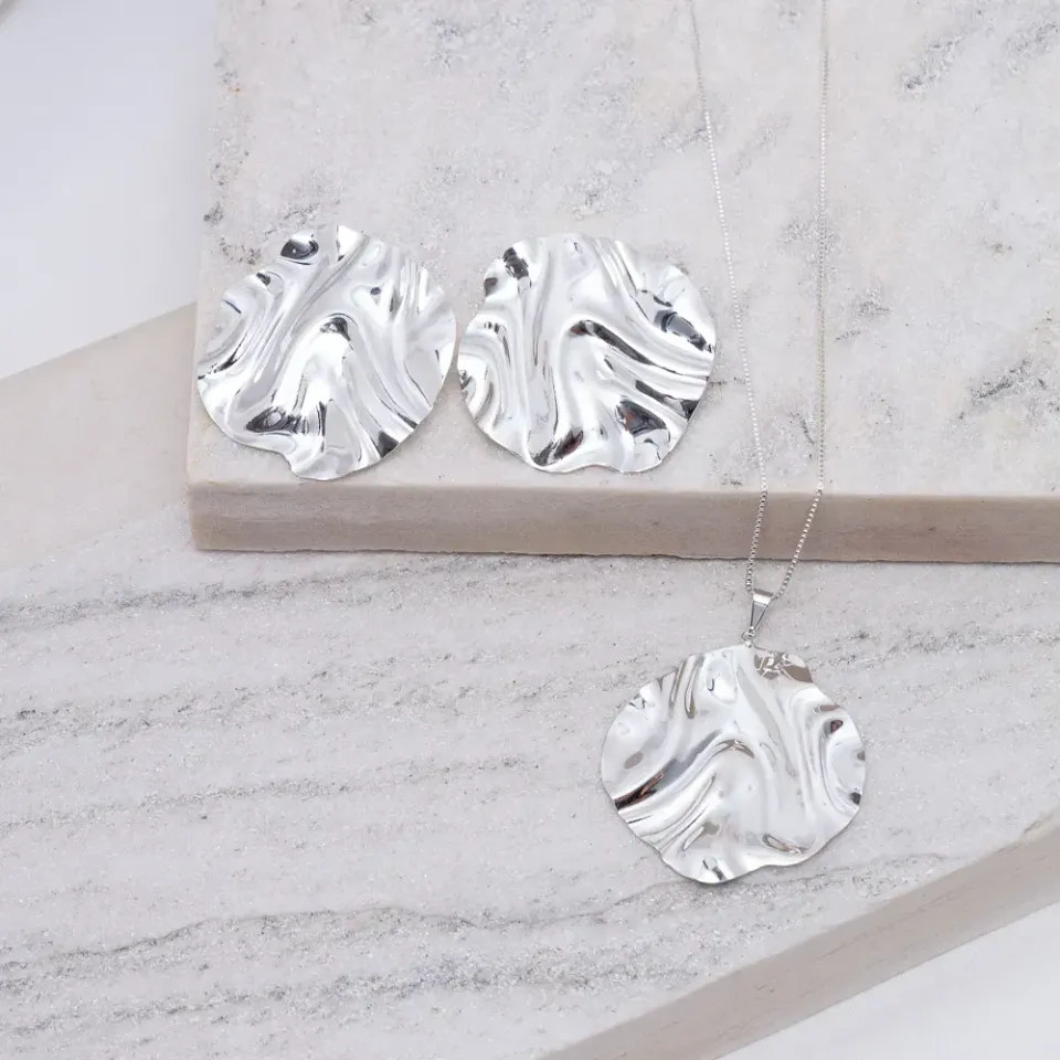 Conjunto Orgânico Esfera Grande Amassado em banho Prata