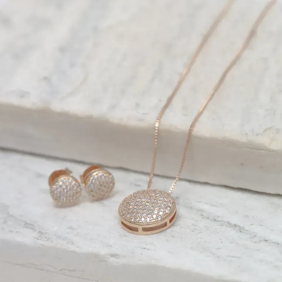CONJUNTO REDONDO CRAVEJADO COM ZIRCÔNIAS BANHO ROSÉ