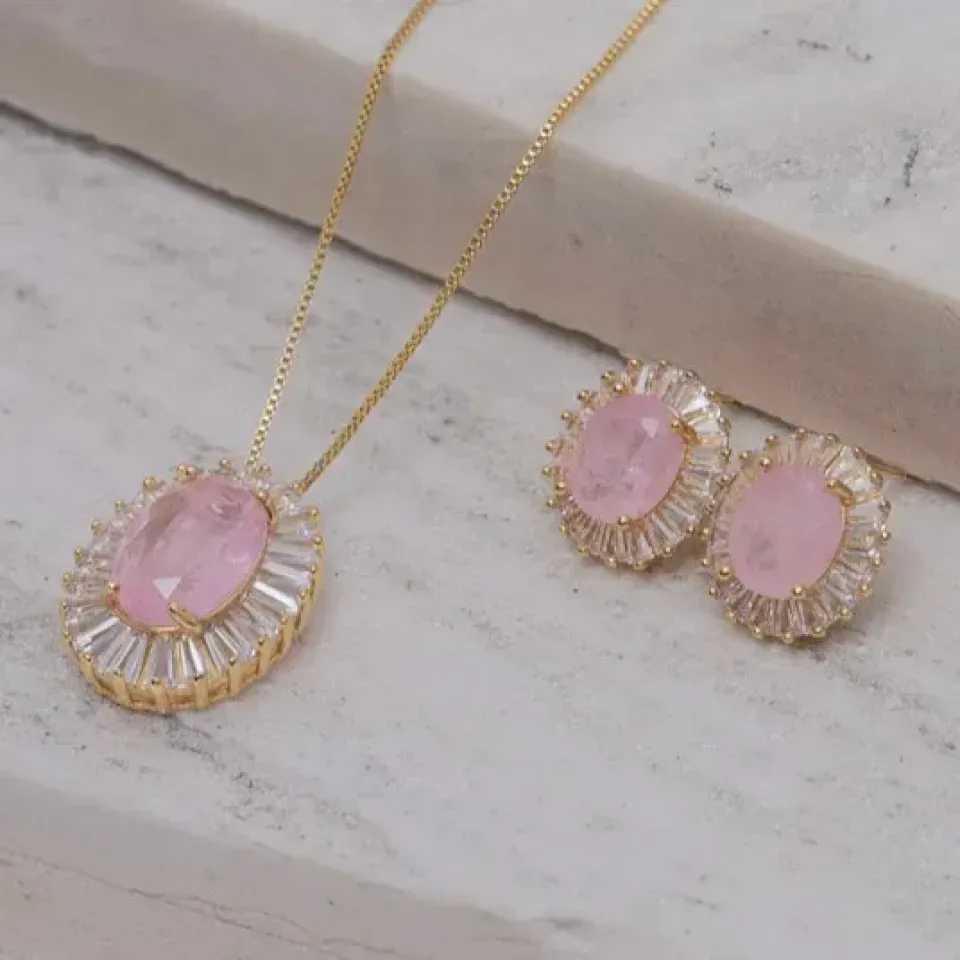 Conjunto Cravejado com Zircônias Cristais e Pedra Rosa Claro em banho Ouro 18K