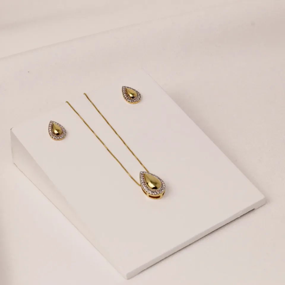 CONJUNTO GOTA CRAVEJADA COM ZIRCÔNIAS CRISTAIS BANHO OURO 18K