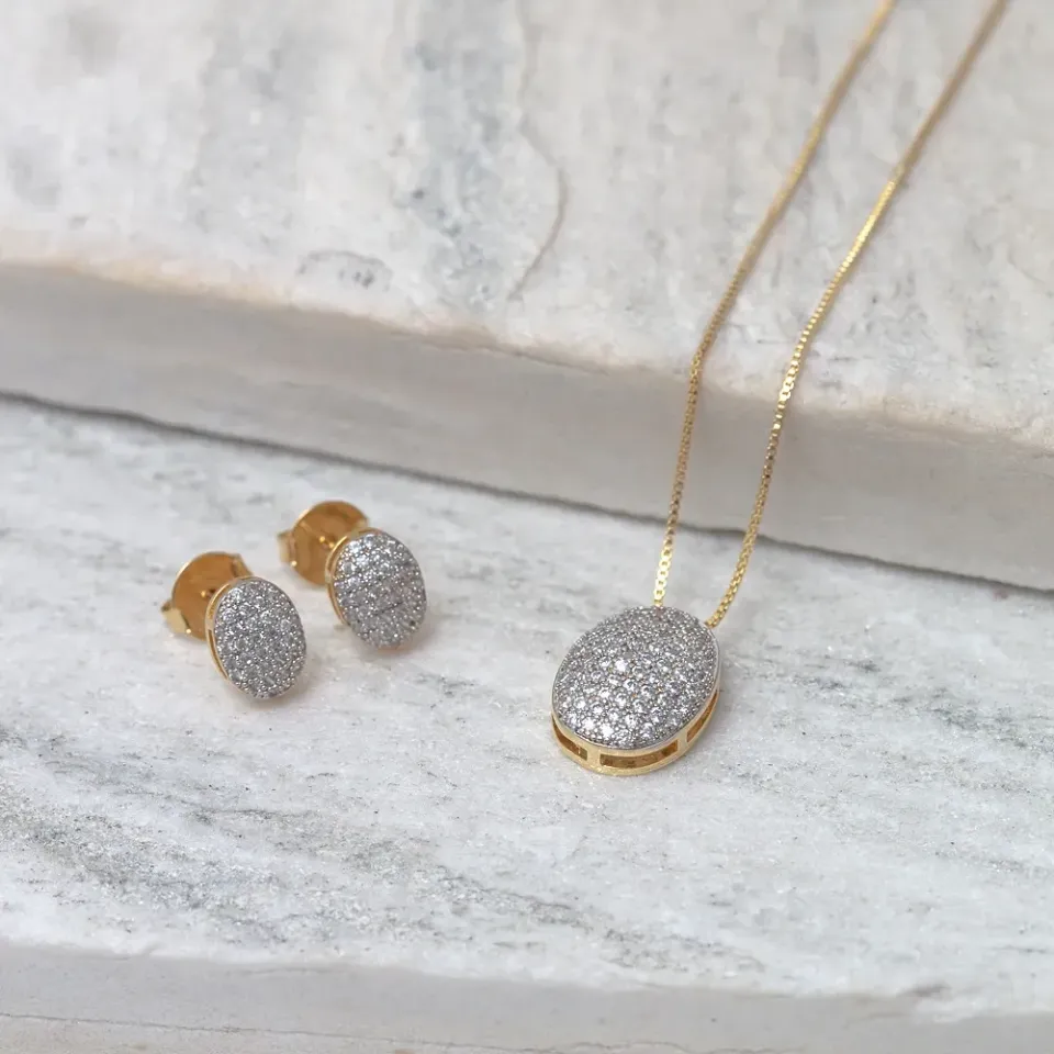 Conjunto Brinco e Colar Oval Cravejados com Zircônias Cristais em banho Ouro 18K