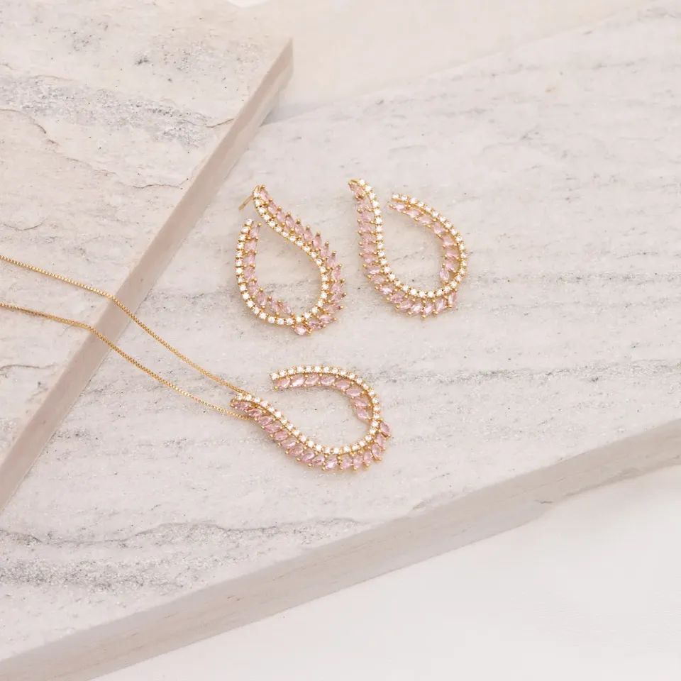 CONJUNTO ZIRCÔNIA ROSA BANHO OURO 18K