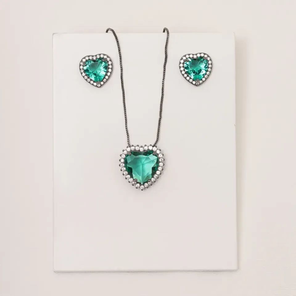 CONJUNTO CORAÇÃO COM PEDRA ZIRCÔNIA VERDE ESMERALDA BANHO RÓDIO NEGRO