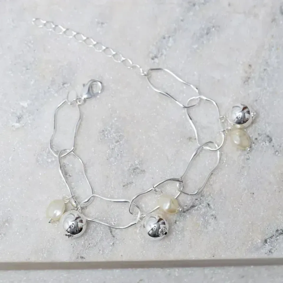 PULSEIRA ELOS IRREGULARES COM BOLINHAS E PÉROLAS BANHO PRATA