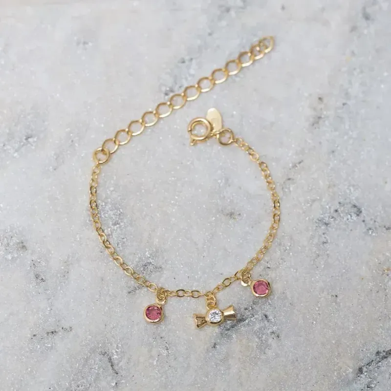 PULSEIRA INFANTIL BOMBOM COM CRISTAIS ROSAS BANHO OURO 18K