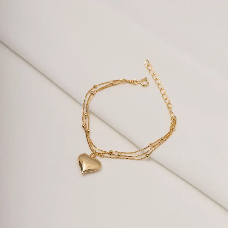 PULSEIRA TRIPLA COM PINGENTE DE CORAÇÃO E BOLINHAS BANHO OURO 18K
