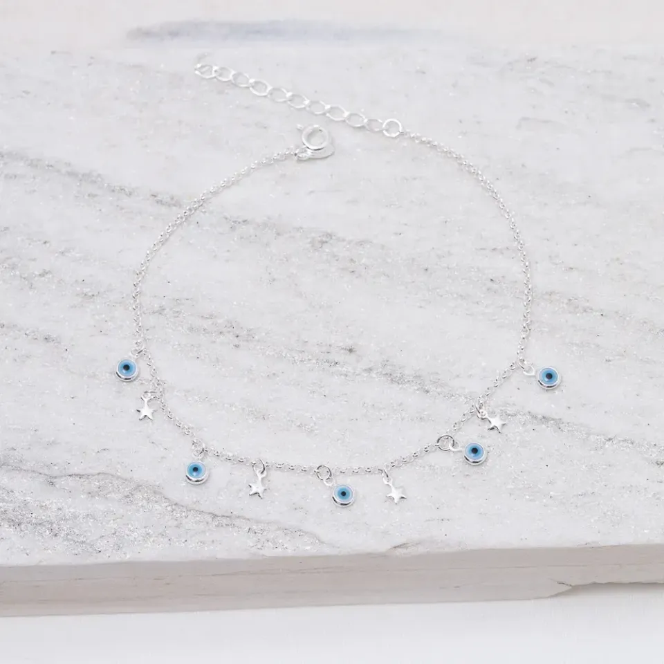 TORNOZELEIRA OLHO GREGO E ESTRELAS BANHO PRATA