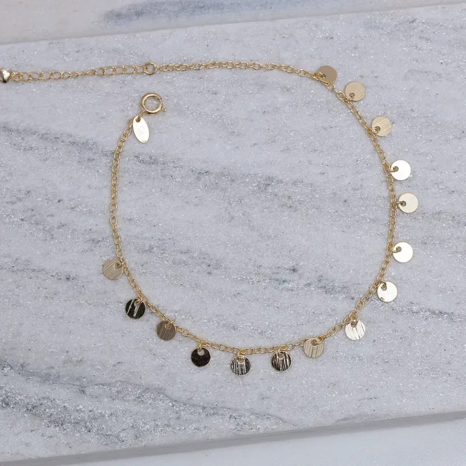 Tornozeleira Plaquinhas Riscadas em banho Ouro 18K
