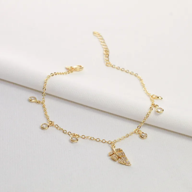 TORNOZELEIRA ZIRCÂNIA E COM PINGENTE DE FOLHA BANHO OURO 18K
